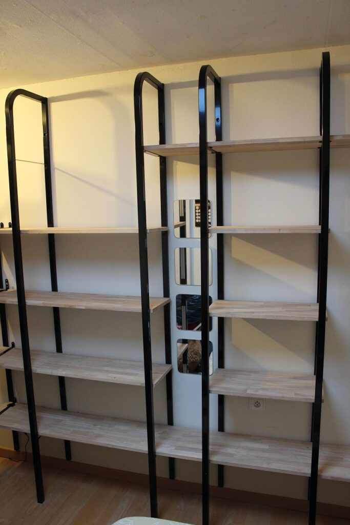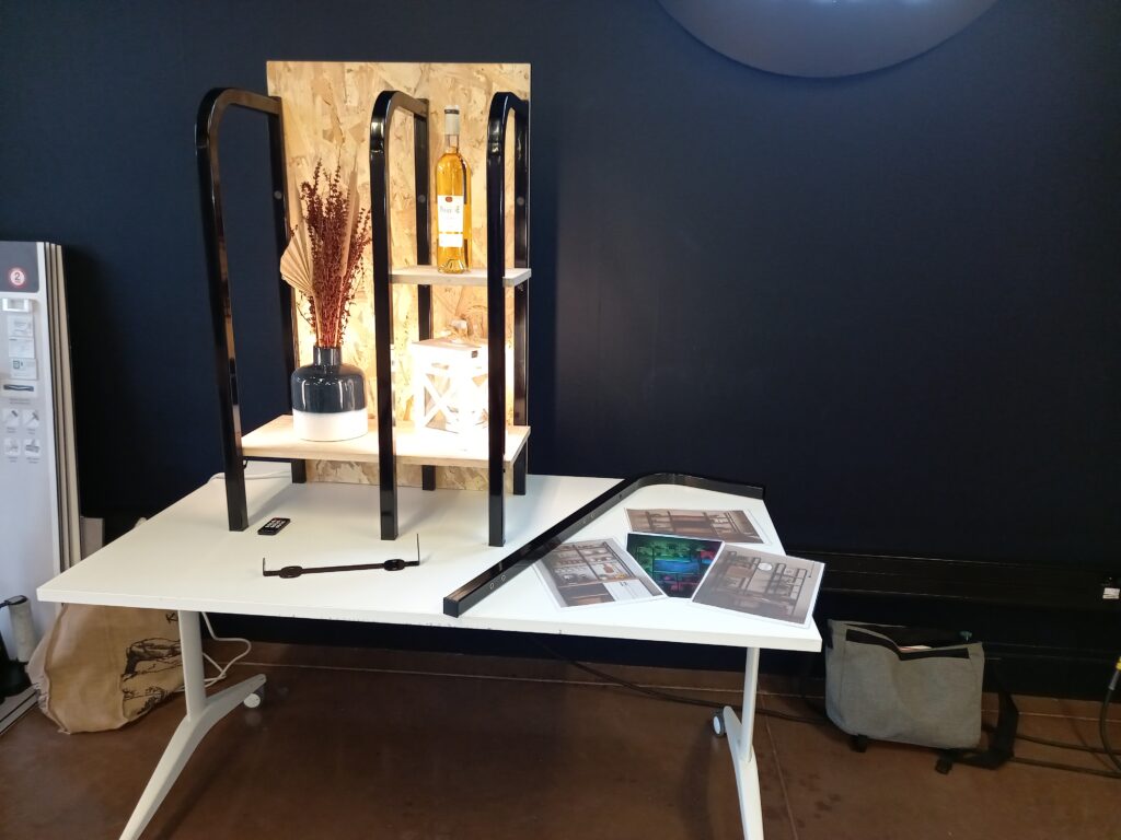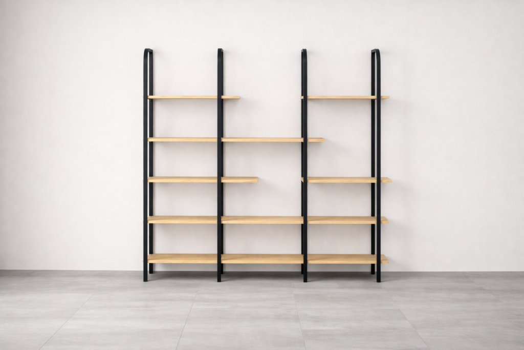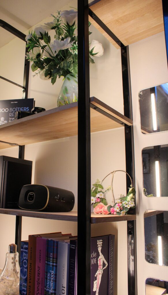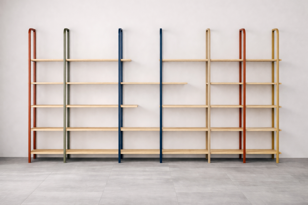 Nos montants en acier avec lumière intégrée permettent de créer des compositions murales sur mesure qui structurent l’espace tout en mettant en valeur les objets, les matériaux et les volumes.